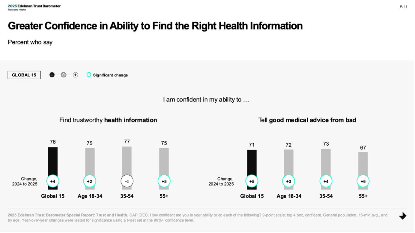 ედელმანის 2025 წლის კვლევით კარგად ვხედავთ ჯანდაცვის სფეროში არსებულ კრიზისს. ადამიანები აღარ ენდობიან დიდ ინსტიტუტებს და მედიცინის პროფესიონალებს, ამჯობინებენ სოციალური მედიასა და პირად კონტაქტებს. მედიცინის პოლიტიზაცია და არასწორი კომუნიკაცია მდგომარეობას კიდევ უფრო ართულებს. სოციალური მედიის ზემოქმედების ზრდა, ხელოვნური ინტელექტის გავრცელება და თვითდიაგნოსტიკის ტენდენციები კიდევ უფრო ართულებს სიტუაციას.